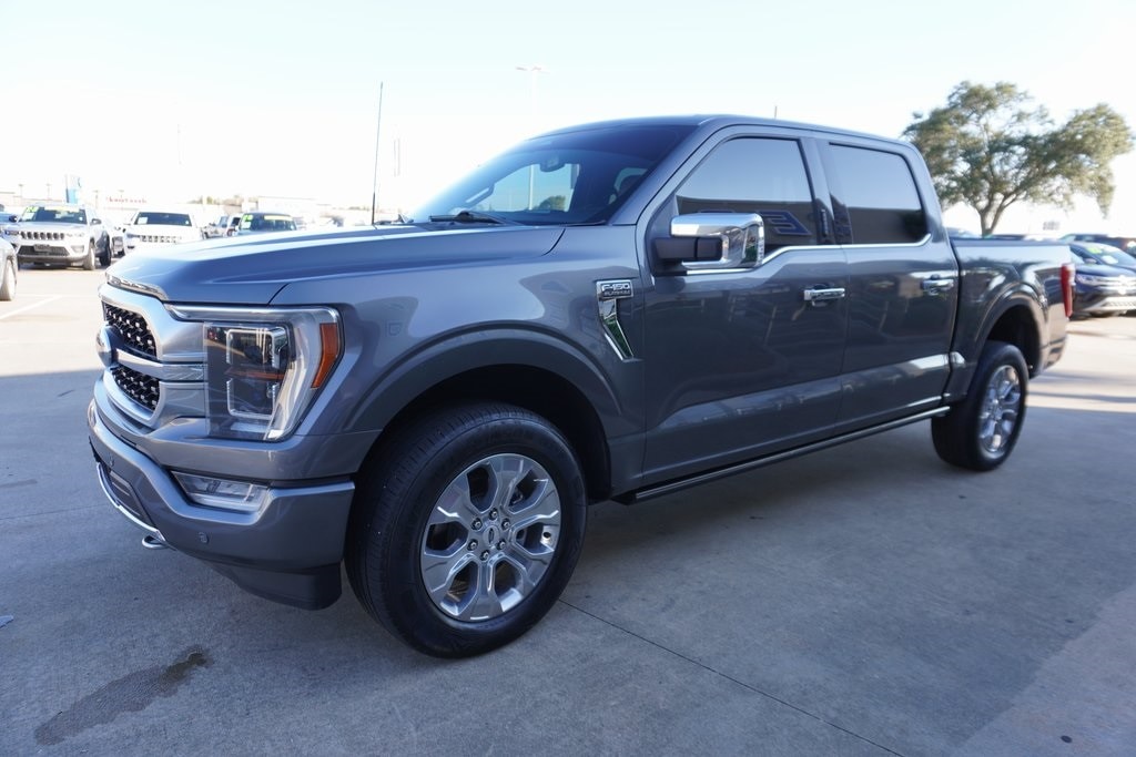 This 2023 Ford F-150 Platinum in Gray Metallic includes the following features: 3.5L V6 EcoBoost 10-Speed Automatic 4WD Equipment Group 700A Standard, 4WD, 20" Polished Aluminum Wheels, 3.31 Axle Ratio, 4-Wheel Disc Brakes, 8 Speakers, ABS brakes, Adjustable pedals, Air Conditioning, Alloy wheels, AM/FM radio: SiriusXM with 360L, Auto High-beam Headlights, Auto tilt-away steering wheel, Auto-dimming door mirrors, Auto-dimming Rear-View mirror, Automatic temperature control, Brake assist, Bumpers: body-color, Class IV Trailer Hitch Receiver, Compass, Delay-off headlights, Driver door bin, Driver vanity mirror, Dual front impact airbags, Dual front side impact airbags, Electronic Stability Control, Emergency communication system: SYNC 4 911 Assist, Exterior Parking Camera Rear, Front anti-roll bar, Front Bucket Seats, Front Center Armrest, Front dual zone A/C, Front fog lights, Front reading lights, Front wheel independent suspension, Fully automatic headlights, Garage door transmitter, Heated door mirrors, Heated front seats, Heated rear seats, Heated steering wheel, Illuminated entry, Inclination/Intrusion Sensor Removal, Integrated Trailer Brake Controller, Low tire pressure warning, Memory seat, Multicontour Seats w/Active Motion Removal, Occupant sensing airbag, Outside temperature display, Overhead airbag, Overhead console, Panic alarm, Passenger door bin, Passenger vanity mirror, Pedal memory, Power door mirrors, Power driver seat, Power passenger seat, Power steering, Power windows, Radio data system, Radio: B&O Sound System by Bang & Olufsen, Rain sensing wipers, Rear reading lights, Rear seat center armrest, Rear step bumper, Rear window defroster, Remote keyless entry, Security system, Speed control, Speed-sensing steering, Split folding rear seat, Steering Wheel Heat Removal (DISC), Steering wheel memory, Steering wheel mounted audio controls, SYNC 4 w/Enhanced Voice Recognition, Tachometer, Telescoping steering wheel, Tilt steering wheel, Traction control, Trip computer, Turn signal indicator mirrors, Unique Multi-Contour Leather Bucket Seats, Variably intermittent wipers, Ventilated front seats, and Voltmeter. Gray Metallic CARFAX One-Owner. 2023 Ford F-150 Platinum 4WD 10-Speed Automatic 3.5L V6 EcoBoost 4WD.