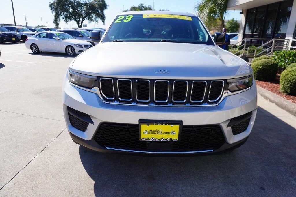 This 2023 Jeep Grand Cherokee Laredo in Silver Zynith includes the following features: 3.6L V6 24V VVT 8-Speed Automatic 4WD Quick Order Package 23A Laredo, 4WD, 3.45 Rear Axle Ratio, 4-Wheel Disc Brakes, 6 Speakers, ABS brakes, Air Conditioning, Alloy wheels, Anti-whiplash front head restraints, Automatic temperature control, Brake assist, Bumpers: body-color, Cloth Seats, Compass, Delay-off headlights, Driver door bin, Driver vanity mirror, Dual front impact airbags, Dual front side impact airbags, Electronic Stability Control, Emergency communication system, Four wheel independent suspension, Front anti-roll bar, Front Bucket Seats, Front Center Armrest w/Storage, Front dual zone A/C, Front License Plate Bracket, Front reading lights, Fully automatic headlights, Heated door mirrors, Illuminated entry, Knee airbag, Low tire pressure warning, Molded In Color Black/Gloss Black Roof Rails, Normal Duty Suspension, Occupant sensing airbag, Outside temperature display, Overhead airbag, Overhead console, Panic alarm, ParkView Rear Back-Up Camera, Passenger door bin, Passenger vanity mirror, Power door mirrors, Power driver seat, Power steering, Power windows, Radio data system, Radio: Uconnect 5 w/8.4" Display, Rear anti-roll bar, Rear reading lights, Rear window defroster, Rear window wiper, Remote keyless entry, Security system, Speed control, Speed-Sensitive Wipers, Split folding rear seat, Spoiler, Steering wheel mounted audio controls, Tachometer, Telescoping steering wheel, Tilt steering wheel, Traction control, Trip computer, Variably intermittent wipers, Voltmeter, and Wheels: 17" x 6.5" Fully Painted Aluminum. Silver Zynith CARFAX One-Owner. 2023 Jeep Grand Cherokee Laredo 4WD 8-Speed Automatic 3.6L V6 24V VVT 4WD.