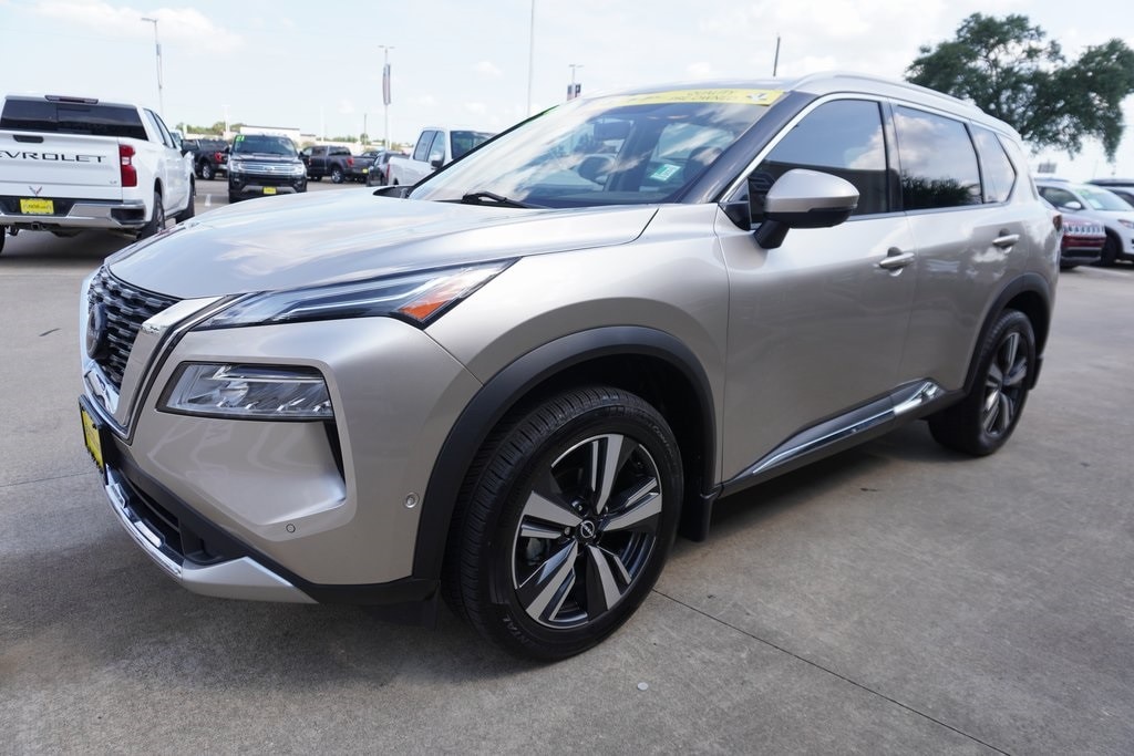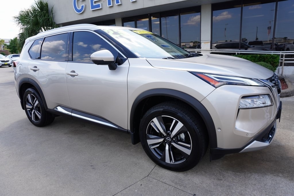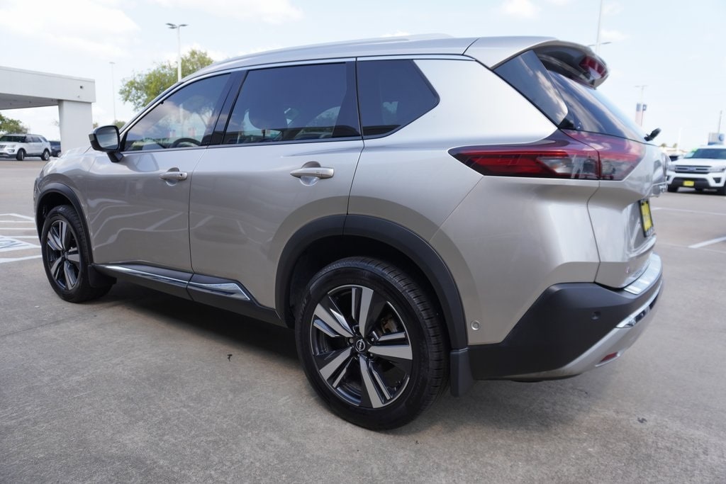 This 2023 Nissan Rogue Platinum in Champagne Silver Metallic includes the following features: 1.5L I3 Turbocharged DOHC 12V LEV3-ULEV50 201hp CVT with Xtronic FWD 10 Speakers, 19" Aluminum Alloy Wheels, 4-Wheel Disc Brakes, 5.604 Axle Ratio, ABS brakes, Air Conditioning, Alloy wheels, AM/FM radio: SiriusXM, Auto High-beam Headlights, Auto-dimming Rear-View mirror, Automatic temperature control, Black Splash Guards (Set of 4), Bose Premium Audio System, Brake assist, Bumpers: body-color, Chrome Rear Bumper Protector, Delay-off headlights, Driver door bin, Driver vanity mirror, Dual front impact airbags, Dual front side impact airbags, Electronic Stability Control, Emergency communication system: NissanConnect Services, External Ground Lighting, First Aid Kit, Floor Mats w/2-Piece Cargo Area Protector, Four wheel independent suspension, Frameless Rearview Mirror w/Universal Remote, Front anti-roll bar, Front Bucket Seats, Front Center Armrest, Front dual zone A/C, Front reading lights, Fully automatic headlights, Heated door mirrors, Heated Front Bucket Seats, Heated front seats, Heated steering wheel, Illuminated entry, Illuminated Kick Plates, Interior Accent Lighting, Knee airbag, Leather steering wheel, Low tire pressure warning, Memory seat, Navigation system: NissanConnect Navigation, NissanConnect featuring Apple CarPlay and Android Auto, Occupant sensing airbag, Outside temperature display, Overhead airbag, Overhead console, Panic alarm, Passenger door bin, Passenger vanity mirror, Power door mirrors, Power driver seat, Power Liftgate, Power moonroof, Power passenger seat, Power steering, Power windows, Quilted Semi-Aniline Leather Seat Trim, Radio data system, Radio: AM/FM NissanConnect w/Navigation, Rear anti-roll bar, Rear reading lights, Rear seat center armrest, Rear side impact airbag, Rear window defroster, Rear window wiper, Remote keyless entry, Security system, Speed control, Speed-Sensitive Wipers, Split folding rear seat, Spoiler, Steering wheel mounted audio controls, Tachometer, Telescoping steering wheel, Tilt steering wheel, Traction control, Trip computer, Turn signal indicator mirrors, and Variably intermittent wipers. Champagne Silver Metallic CARFAX One-Owner. 2023 Nissan Rogue Platinum FWD CVT with Xtronic 1.5L I3 Turbocharged DOHC 12V LEV3-ULEV50 201hp