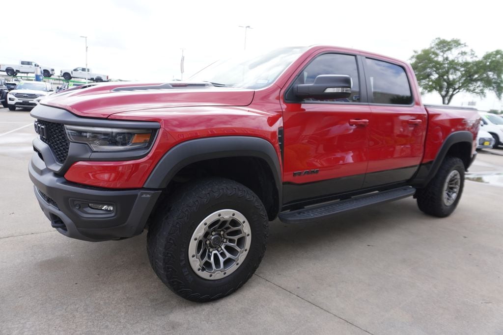 This 2022 Ram 1500 TRX in Flame Red Clearcoat includes the following features: 6.2L Supercharged HEMI V8 SRT 8-Speed Automatic 4WD Bed Utility Group (MOPAR 4 Adjustable Cargo Tie-Down Hooks, MOPAR Deployable Bed Step, and MOPAR Spray In Bedliner), Quick Order Package 29Y, Trailer Tow Group (Trailer Brake Control, Trailer Light Check, and Trailer Tire Pressure Monitoring System), TRX Carbon Fiber Package (Leather/Carbon Flat-Bottom Steering Wheel and Real Carbon Fiber Interior Accents), TRX Level 2 Equipment Group (#2 Seat Foam Cushion, 2-Door Passive Entry, Front Door Locks, 4 Way Front Headrests, Blind Spot & Cross Path Detection, Body Color Door Handles, Bucket Seats, Center Console Parts Module, Digital Rearview Mirror, Driver Seat Memory, Driver/Passenger Wrapped Assist Handles, Exterior Mirrors w/Memory, Front Door Accent Lighting, Front Seat Back Map Pockets, Full Length Premium Upgraded Floor Console, harman/kardon 19 Speaker Premium Sound, Heads-Up Display, Heated Front Seats, Heated Second Row Seats, Heated Steering Wheel, IP LED Ambient Light Pipe, Leather Trimmed Bucket Seats, Leather/Suede Flat-Bottom Steering Wheel, LED CHMSL Lamp, Luxury Front Door Trim Panel, MOPAR Bright Pedal Kit, ParkSense Front/Rear Park Assist w/Stop, Pick-Up Box Lighting, Power 4-Way Driver Lumbar Adjust, Power 4-Way Passenger Lumbar Adjust, Power 8-Way Driver & Passenger Seats, Power Adjustable Pedals w/Memory, Premium Wrapped IP Bezel, Radio/Driver Seat/Mirrors/Pedals Memory, Rain Sensitive Windshield Wipers, Rear 60/40 Folding Seat, Rear 60/40 Folding Split Recline Seat, Rear Door Accent Lighting, Rear Underseat Compartment Storage, Rear Window Defroster, Remote Tailgate Release, Sun Visors w/Illuminated Vanity Mirrors, Surround View Camera System, Universal Garage Door Opener, Ventilated Front Seats, Ventilated Rear Seats, and Wireless Charging Pad), 10 Speakers, 3.55 Rear Axle Ratio, 4-Wheel Disc Brakes, ABS brakes, Adaptive suspension, Air Conditioning, Alloy wheels, AM/FM radio: SiriusXM with 360L, Apple CarPlay/Android Auto, Auto High-beam Headlights, Auto-dimming door mirrors, Auto-dimming Rear-View mirror, Automatic temperature control, Black Exterior Mirrors, Brake assist, Cloth/Vinyl Bucket Seats, Compass, Delay-off headlights, Dome Dual LED Reading Lamp, Driver door bin, Dual front impact airbags, Dual front side impact airbags, Dual-Pane Panoramic Sunroof, Electronic Stability Control, Exterior Mirrors Courtesy Lamps, Exterior Mirrors w/Heating Element, Exterior Mirrors w/Supplemental Signals, Front anti-roll bar, Front Bucket Seats, Front Center Armrest w/Storage, Front dual zone A/C, Front fog lights, Front License Plate Bracket, Front reading lights, Front wheel independent suspension, Fully automatic headlights, Heated door mirrors, Illuminated entry, Leather Shift Knob, Leather steering wheel, Low tire pressure warning, MOPAR Off-Road Style Running Boards, MOPAR TRX Exterior Graphics, MOPAR TRX Hood Graphics, Navigation System, Occupant sensing airbag, Outside temperature display, Overhead airbag, Overhead console, Panic alarm, ParkView Rear Back-Up Camera, Passenger door bin, Passenger vanity mirror, Power door mirrors, Power driver seat, Power steering, Power windows, Power-Folding Mirrors, Radio data system, Radio: Uconnect 5 Nav w/12.0" Display, Rear seat center armrest, Rear step bumper, Remote keyless entry, Security system, Speed control, Split folding rear seat, Sport steering wheel, Steering wheel mounted audio controls, Tachometer, Telescoping steering wheel, Tilt steering wheel, Traction control, Trailer Reverse Steering Control, Tri-Fold Tonneau Cover, Trip computer, TRX Red Interior Accents, Turn signal indicator mirrors, Variably intermittent wipers, Voltmeter, Wheels: 18" x 9" Bead-Lock Aluminum, and Wheels: 18" x 9" Black Paint/Polish Aluminum. Flame Red Clearcoat CARFAX One-Owner. 2022 Ram 1500 TRX 4WD 8-Speed Automatic 6.2L Supercharged HEMI V8 SRT